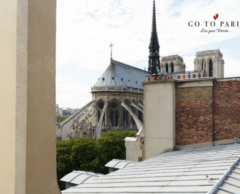 Lägenheten ligger på Rue du Cloître Notre-Dame som är en historisk och lugn gata i det 4:e arrondissementet i Paris, belägen på Île de la Cité, alldeles intill katedralen Notre-Dame. Den omges av vackra gamla byggnader och har en atmosfär präglad av stadens rika arv. Gatan erbjuder en fantastisk utsikt över katedralens arkitektur och ligger nära sevärdheter som Square Jean XXIII och Seinefloden. Trots sitt centrala läge har Rue du Cloître Notre-Dame en relativt fridfull atmosfär, med några bostäder och butiker. Dess närhet till historiska landmärken och goda transportförbindelser gör den till en unik del av Paris.